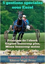 La gestion GEXPEC : 5 gestions spéciales Pour tirer le meilleur parti de ces gestions, un baromètre Ecart/Forme intégré compense les périodes d'écarts qui sont le gros point noir de beaucoup de gestions et qui module la façon de jouer en fonction de celui-ci. Une fonction supplémentaire de lissage recalcule les mises pour les adapter à l'écart forme ce qui permet de jouer au plus juste pour augmenter les bénéfices. | 10 nouvelles gestions financières Augmentez vos bénéfices rapidement ! Gérez plusieurs chevaux dans une même course, une même réunion ou une même journée ! | La gestion RLN : Rapport Logarithme Népérien C'est une très belle gestion très mathématique. Mais bien évidemment, malgré son nom très scientifique, son utilisation demeure fort simple... |