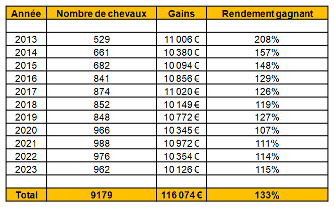Total en simple placé : 96321 € en jouant 10€ à chaque fois.