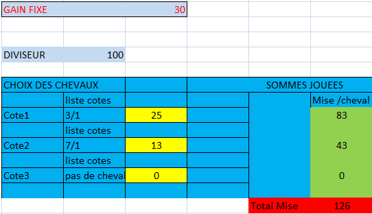 Un répartiteur de mise vous permet d'optimiser vos gains avec un minimum de mises. Et de faire du bénéfice en théorie au jeu simple gagnant si un de vos chevaux est à l'arrivée. Les 4 répartiteurs de mises présentés ici vous permettent de jouer jusqu'à 3 chevaux par course et sont donc idéal pour les chevaux du site réussir facilement puisque nous donnons un maximum de 3 chevaux par quinté. Vous pouez jouer avec les cotes probables (les cotes données la veille des courses) ou avec les cotes réelles (les cotes données juste avant le départ des courses). Voici les caractéristiques des 4 formules :